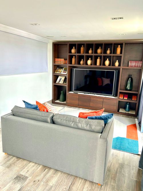 On the first level, there's the living-dining area, kitchen, secondary bedroom, and a full bathroom shared with guests. Moving up, you'll find the master bedroom with its bathroom and huge walk-in closet, with access to one of the terraces. Finally, on the third level, there's the family room equipped with a sofa bed, a full bathroom, and access to the second terrace.